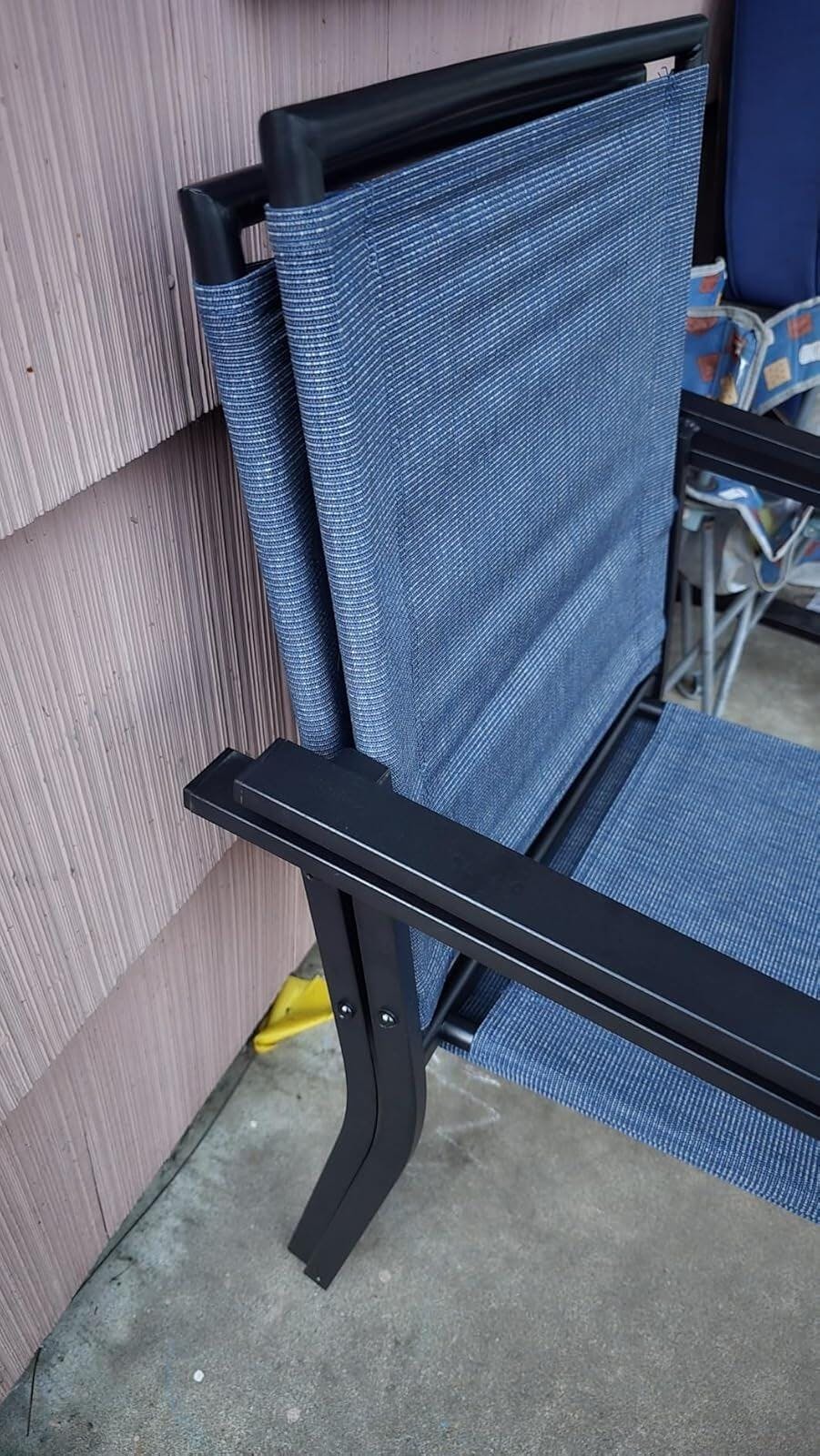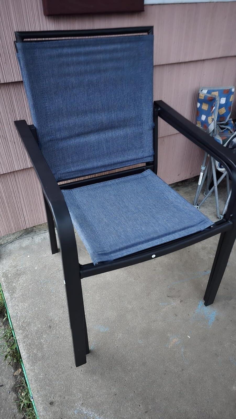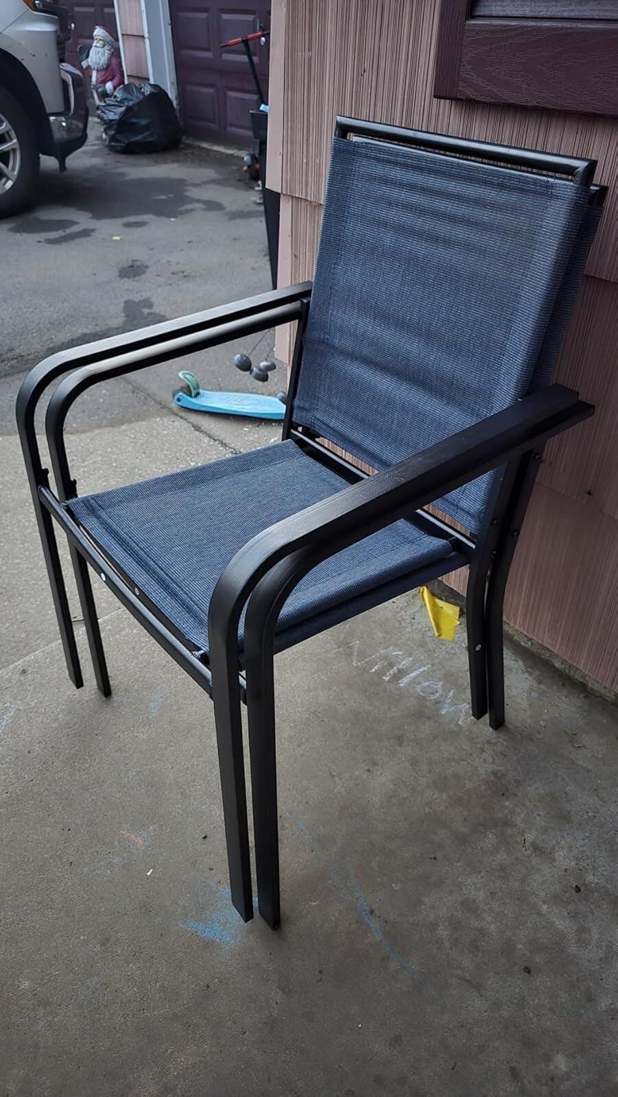 These stackable chairs were easy to put together. All screw holes lined up perfectly making it quick and easy to complete. The chairs are sturdy and stackable nicely on top of each other. The slate blue color is beautiful. These made a great set of extra outdoor chairs for our patio.